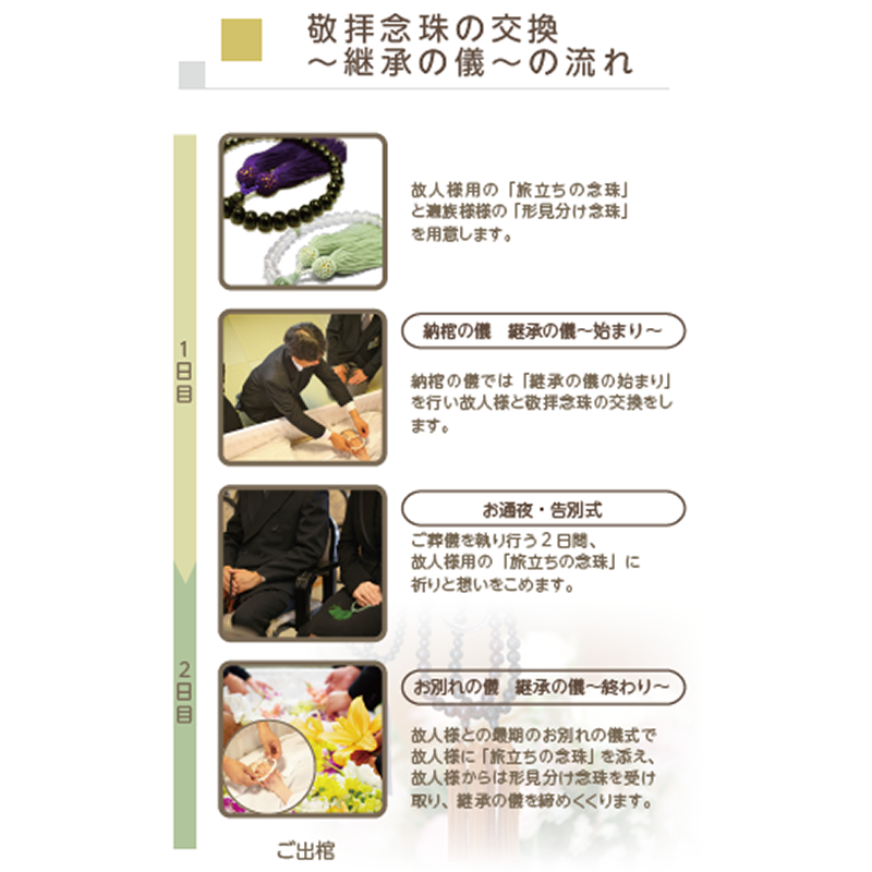 サン・ライフでは、喪家様に有意義なお別れをしていただく為に、納棺の儀、お別れの儀、それぞれにおいて、故人様と「敬拝念珠」を交換していただく「継承の儀」を執り行っております。