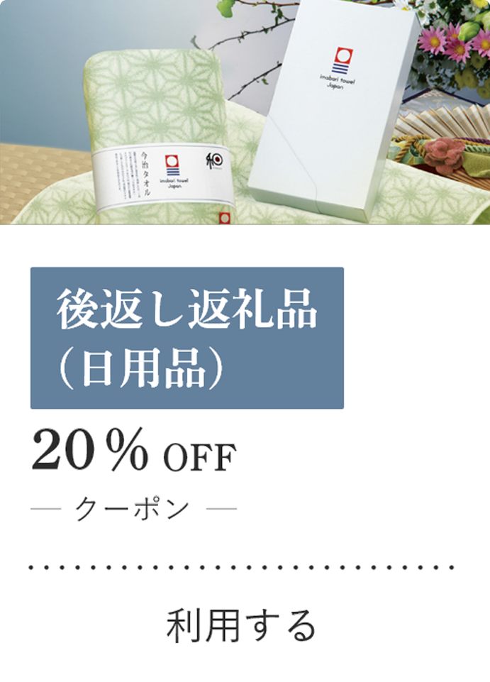 ご葬儀当日に高額のお香典をいただいた方や特にお世話になった方へのお返し、また、当日返しをしない風習の地域でご葬儀の後日にお返しをする場合、返礼品の代金を20%割引いたします。(個別発送対応)