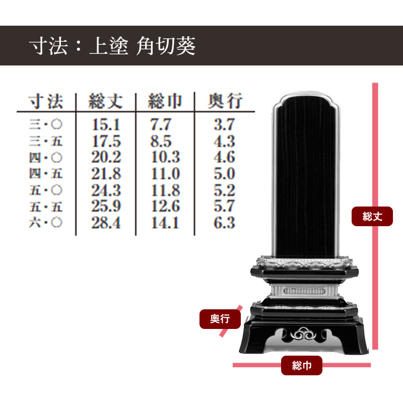 お位牌の大きさに関しましては、初めての購入であればお仏壇に合ったサイズのものをお選びください。上置きタイプであれば 3.5 寸~ 4.5 寸。台付きタイプであれば 4.0 寸~ 5.0寸をお選びいただくお客様が多いですが、お仏壇にご安置できる大きさであれば問題はありません。
