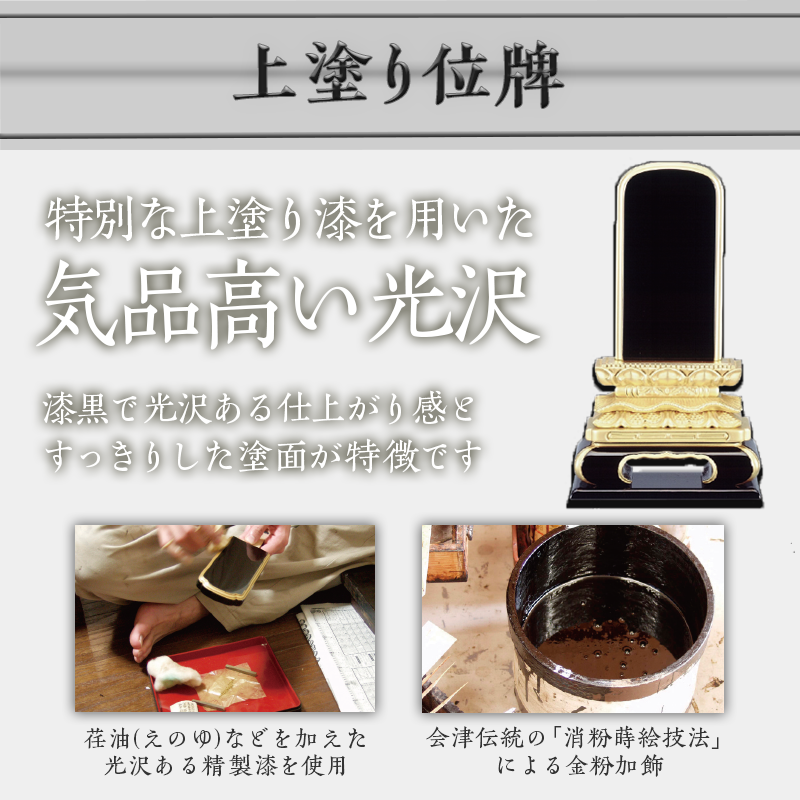 ご葬儀の際にお使い頂いた白木位牌のお戒名又はお俗名を専用の注文用紙に書き写しをさせて頂きます。ご自宅へ伺い書き写しをさせて頂くことも承っております。店舗へご来店される際は白木のお位牌をお連れいただくか、白木の表裏のお写真をお持ち下さい。また、ご先祖様のお位牌がございましたら、お連れいただくか、表裏のお写真、位牌の大きさ(上から下まで)をお調べください。