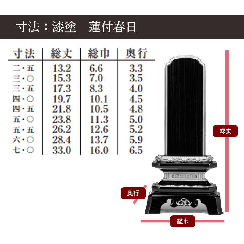 ただし、寸に関しては文字を入れる板部分のサイズの事であり、総丈ではないのでそれぞれのお位牌の