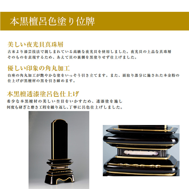 希少な本黒檀材の美しい杢目をいかすため、透漆塗を施し何度も研ぎと磨き工程を繰り返し、丁寧に呂色仕上げしました。