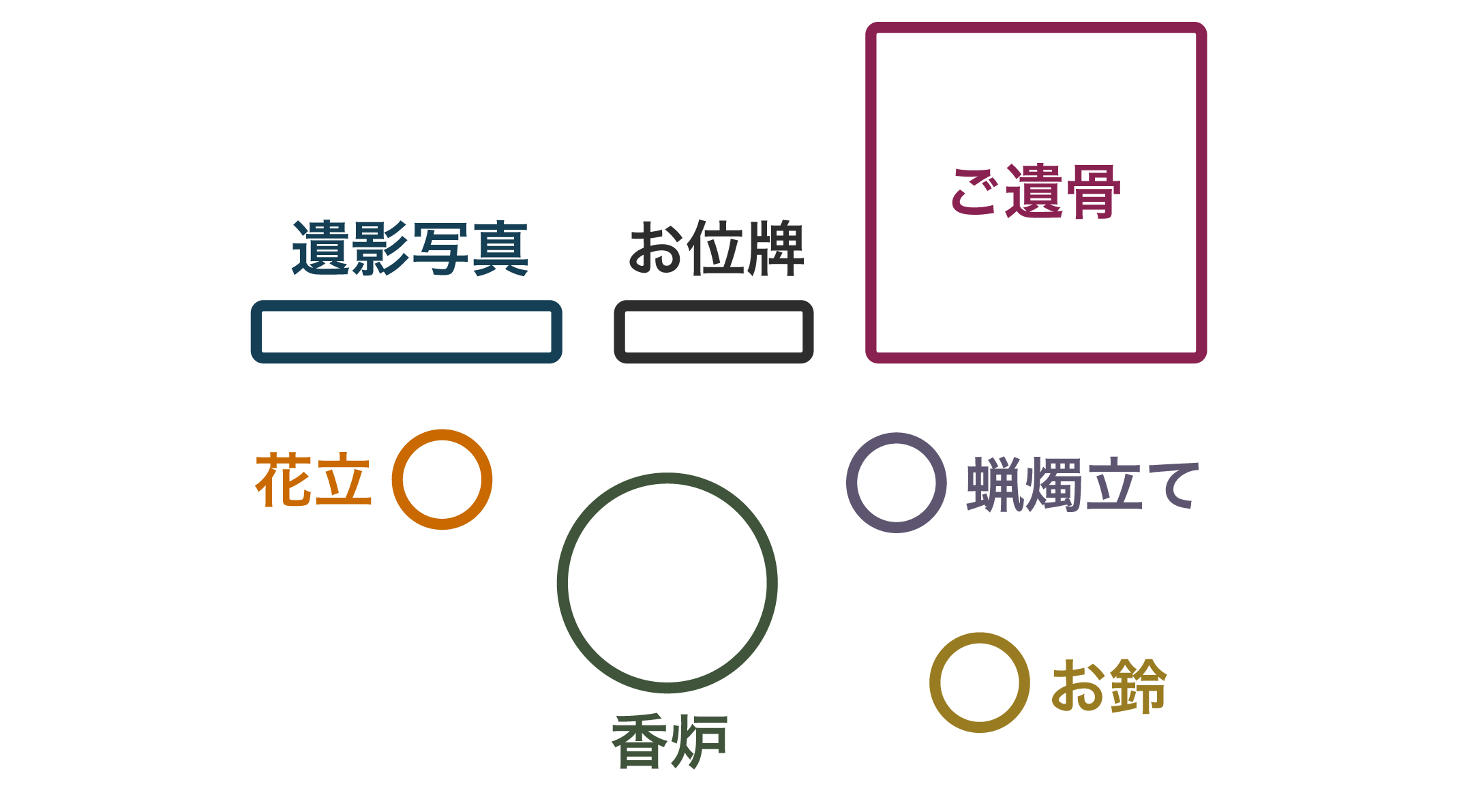 ご遺骨をご安置する場所には、ほかに位牌、遺影写真(小さい写真だけ飾ることもあります)、香炉、燭台、花立、リン、などを置きます。